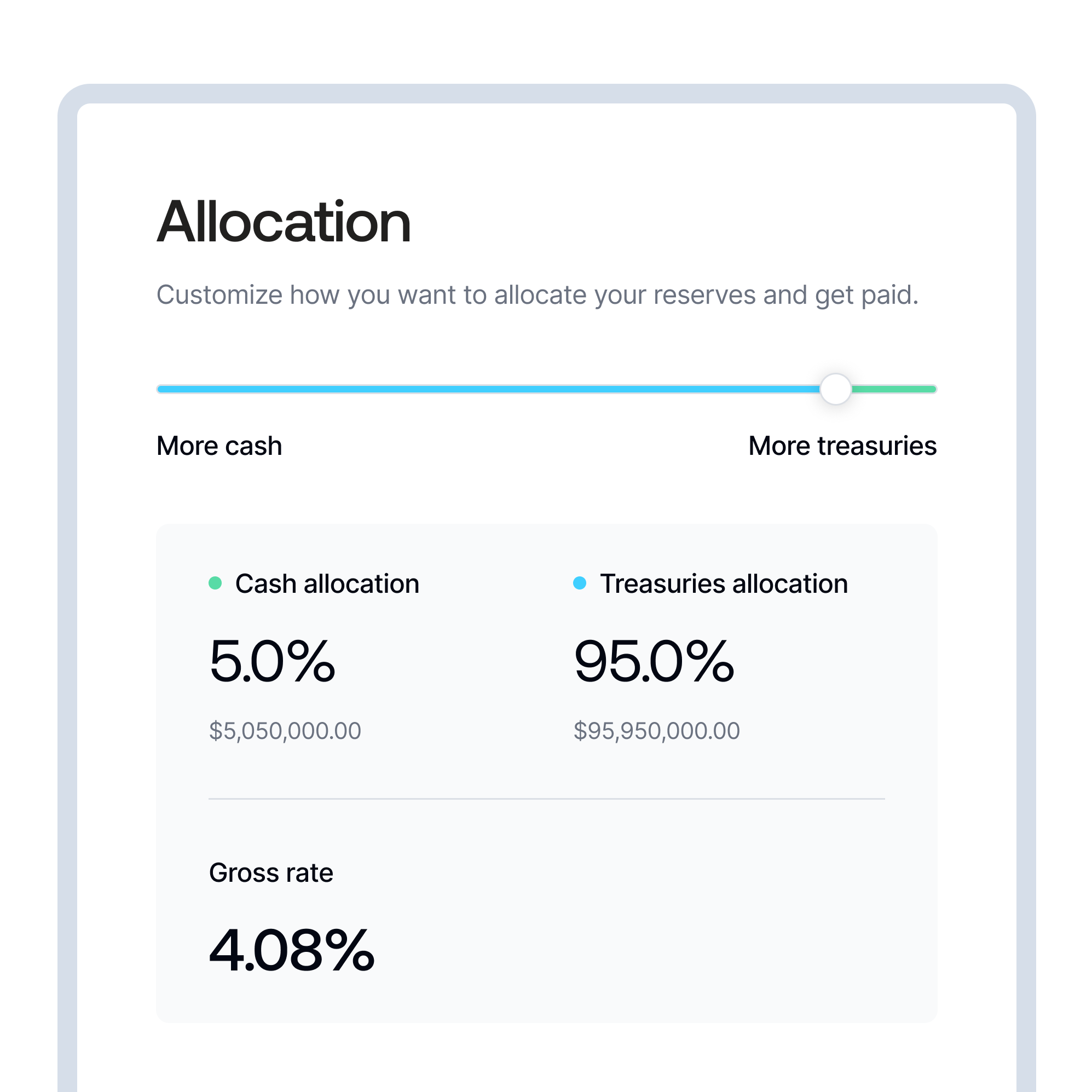 Choose your allocation of cash, treasuries, and onchain assets to achieve your rewards strategy. Optionally stream your earnings daily.